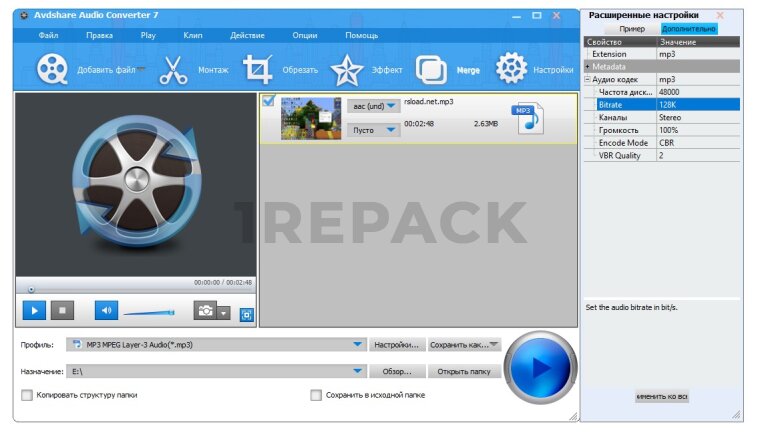 - Настройка параметров аудио, таких как битрейт и частота дискретизации
