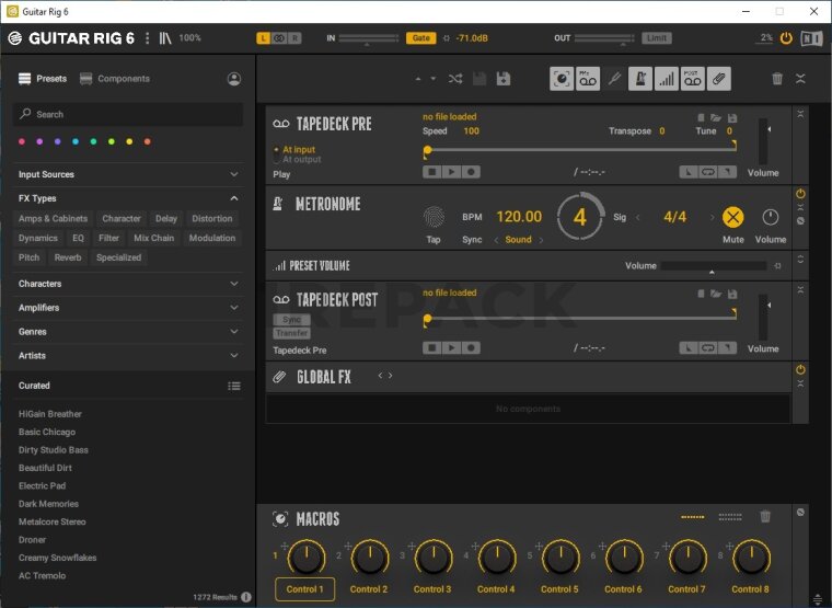Guitar Rig 7 Pro — это программное обеспечение для моделирования гитарных и басовых усилителей и эффектов, разработанное компанией Native Instruments. Оно предоставляет музыкантам возможность создавать разнообразные звуковые текстуры, используя виртуальные эмуляции реального оборудования.Программа предлагает широкий спектр инструментов для обработки звука, включая различные модели усилителей, кабинетов, микрофонов и педалей эффектов. Пользователи могут комбинировать эти элементы в уникальные сигнальные цепочки, настраивая звучание по своему вкусу.