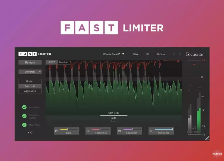 Focusrite Fast Limiter — это инструмент, который сочетает в себе мощные алгоритмы и простоту использования, помогая музыкантам и звуковым инженерам быстро достигать качественного звучания на этапе мастеринга.