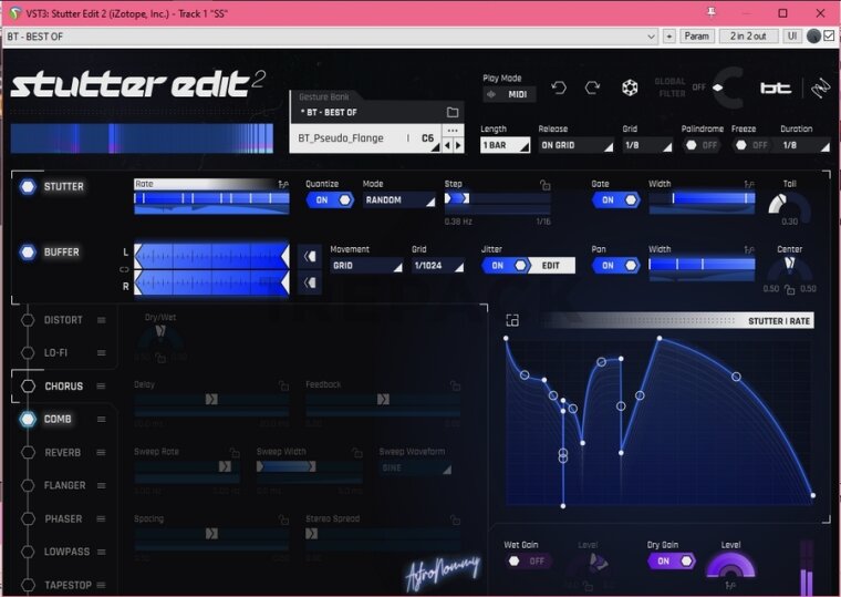 iZotope Stutter Edit — это профессиональный аудиоплагин для создания сложных ритмических эффектов и "статтеринг"-эффектов (повторяющихся фрагментов звука) в реальном времени. Разработанный в сотрудничестве с известным продюсером BT, этот инструмент позволяет музыкантам, диджеям и звуковым дизайнерам моментально изменять и модулировать звуковые сигналы, создавая динамичные эффекты, которые часто используются в электронной музыке, диджеинге и звуковом дизайне для фильмов и игр.Основной функционал iZotope Stutter Edit заключается в разбиении аудиосигнала на маленькие фрагменты и его воспроизведении с различными ритмическими изменениями, что создаёт эффект "запинания" или "заикания" звука. Помимо статтер-эффектов, плагин поддерживает применение таких обработок, как фильтрация, дисторшн, реверберация и другие. Эти эффекты можно синхронизировать с темпом трека и управлять ими в реальном времени через MIDI-контроллеры, что даёт пользователям полную свободу в создании музыкальных фраз и эффектов.