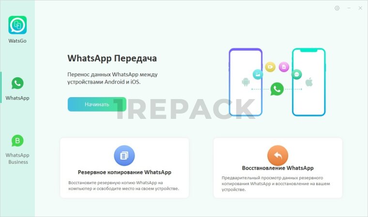 iToolab WatsGo — это инструмент для резервного копирования, восстановления и переноса данных WhatsApp между устройствами на разных операционных системах, включая iOS и Android. Программа позволяет сохранять чаты, медиафайлы и документы, а также быстро восстанавливать их в случае необходимости или переносить на новое устройство. WatsGo особенно полезен для тех, кто переходит с одного устройства на другое и хочет сохранить всю историю переписки.Основная функция iToolab WatsGo — перенос данных WhatsApp между iOS и Android. Программа обеспечивает лёгкий процесс переноса, сохраняя все чаты, фото, видео и аудиофайлы, что позволяет начать работу на новом устройстве с полной историей переписки. Это удобно для пользователей, которые часто меняют телефоны или работают на нескольких устройствах.