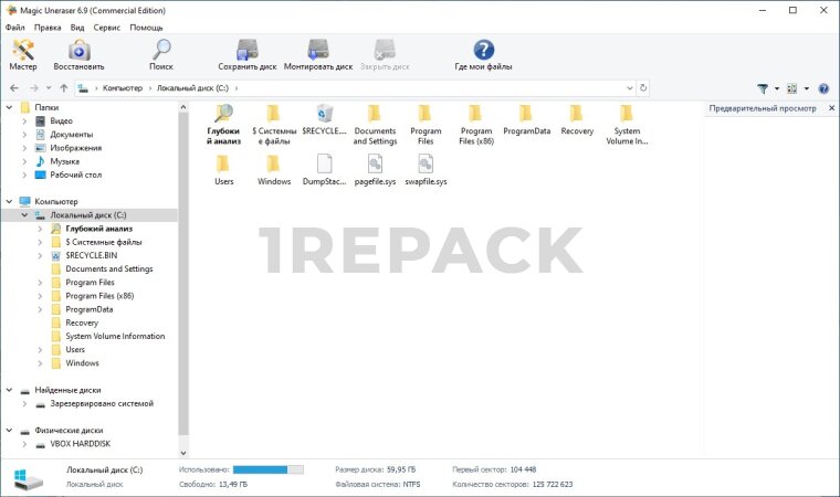 - Глубокое сканирование для обнаружения труднонаходимых файлов
