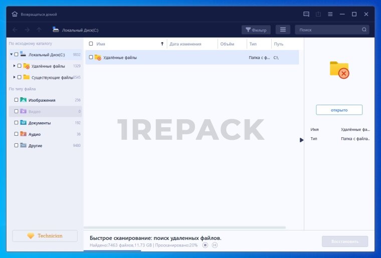 - Глубокое и быстрое сканирование для поиска удалённых файлов