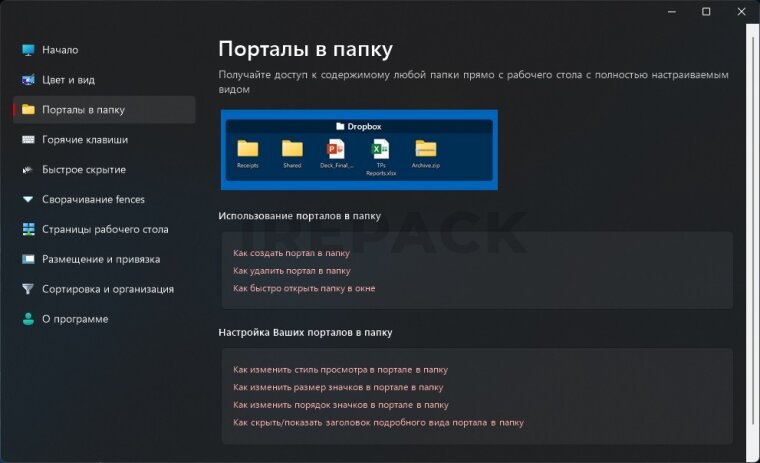 Fences интегрируется с проводником Windows, что делает возможным управление папками прямо с рабочего стола, не переходя в другие окна. Также можно закрепить важные папки и документы, чтобы они всегда были под рукой.