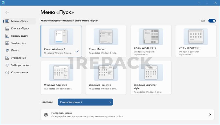 - Настройка меню «Пуск» под стили Windows 7, 10 и 11;