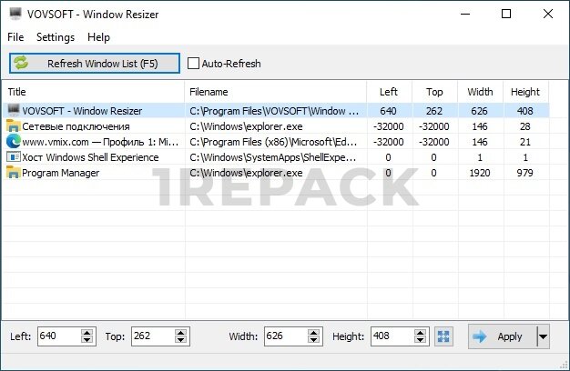 Window Resizer позволяет задать точные координаты окна на экране, обеспечивая полный контроль над его позицией. Пользователи могут управлять как отдельными приложениями, так и несколькими окнами одновременно, что помогает организовать рабочее пространство.