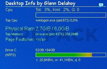 Desktop Info — удобная утилита, которая размещает сведения о работе системы прямо на рабочем столе, поверх обоев, не создавая дополнительных окон и не отвлекая от основного интерфейса. Информация обновляется в реальном времени и визуально встроена в фон, что делает её частью общего оформления экрана. Это решение подойдёт как для наблюдения за состоянием персонального компьютера, так и для контроля серверных или рабочих станций.Программа отображает данные о загрузке процессора, объёме используемой оперативной памяти, состоянии дисков, температуре компонентов, сетевой активности и других параметрах. Всё это выводится автоматически и обновляется с заданной периодичностью без вмешательства пользователя. Элементы интерфейса не блокируют мышь, не мешают кликам и не влияют на взаимодействие с ярлыками и приложениями.