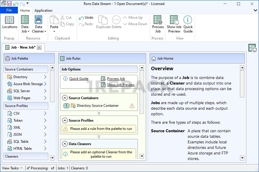 Rons Data Stream Pro — программа, позволяющая быстро и гибко обрабатывать табличные данные. Она может выстраивать цепочки действий, чтобы загружать, очищать, фильтровать и преобразовывать информацию из различных источников в автоматическом режиме. Приложение подходит для задач, связанных с подготовкой и трансформацией больших массивов данных, особенно в формате CSV.В основе инструмента лежит два ключевых элемента — «Cleaners» и «Jobs». Cleaners — это списки правил, которые обрабатывают содержимое строк, столбцов и отдельных ячеек. Jobs, в свою очередь, объединяют входные файлы, наборы правил и параметры сохранения результатов, формируя полноценный рабочий процесс, который можно запускать многократно без ручных изменений.