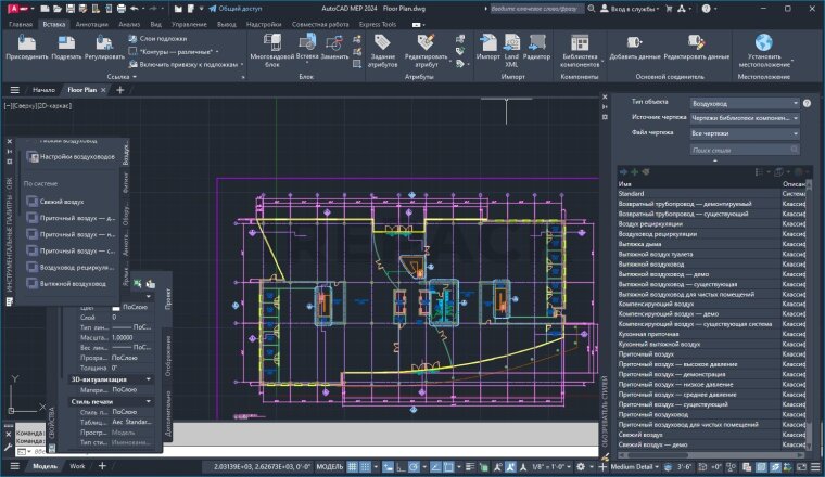 AutoCAD MEP 2024 обеспечивает тесную интеграцию с BIM (Building Information Modeling) для работы с моделями и улучшения координации между разными дисциплинами проектирования. Это позволяет архитекторам, инженерам и строителям работать в одной среде, минимизируя ошибки и улучшая качество проектной документации. Поддержка формата IFC и возможность импорта/экспорта данных делают программу совместимой с другими BIM-инструментами.