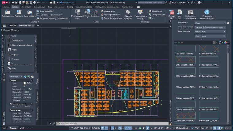 AutoCAD Architecture 2024 обеспечивает более продуктивную работу благодаря возможностям повторного использования объектов и шаблонов. Программа включает библиотеки стандартных архитектурных элементов и стилей, что позволяет создавать проекты быстрее и точнее. Эти библиотеки могут быть настроены под требования конкретного проекта или корпоративные стандарты.