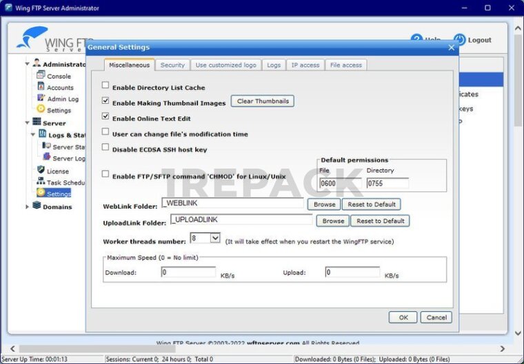Также Wing FTP Server включает средства для контроля трафика и управления сеансами, что помогает избежать перегрузки сети и контролировать доступ пользователей в режиме реального времени. Это делает программу подходящей для компаний с большим количеством подключений и интенсивным использованием сервера.