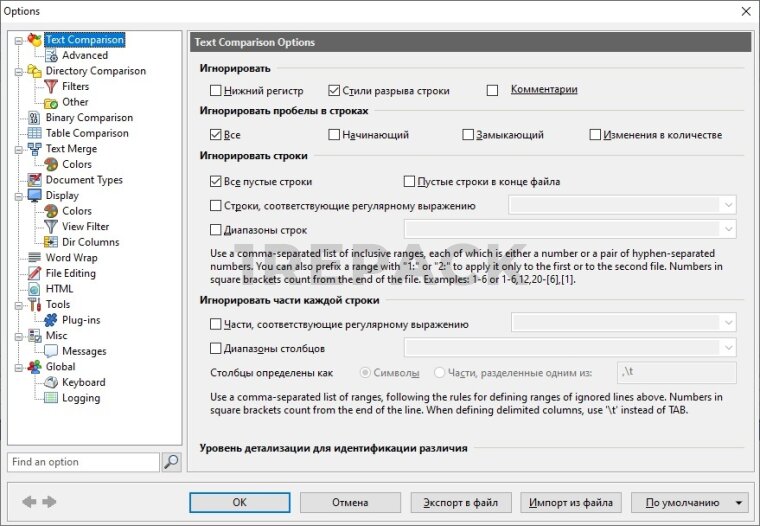 Программа поддерживает использование регулярных выражений, что позволяет находить и игнорировать определенные типы изменений, такие как пробелы или комментарии. Это полезно для очистки данных и упрощает анализ сложных файлов, убирая из сравнения ненужные элементы и оставляя только значимые различия.