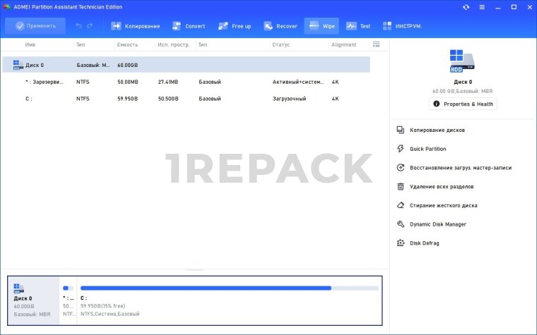 AOMEI Partition Assistant Pro — программа для управления разделами жесткого диска, обеспечивающая широкий спектр возможностей по настройке, оптимизации и изменению структуры хранения данных. Она позволяет пользователям эффективно управлять объемом дискового пространства, выполняя задачи по разделению, объединению, копированию и преобразованию разделов.С помощью AOMEI Partition Assistant Pro можно изменить размер существующих разделов без потери данных, что позволяет перераспределить свободное место между разделами и улучшить общее использование дискового пространства. Эта функция полезна при необходимости расширить системный раздел или создать дополнительное место для новых данных.