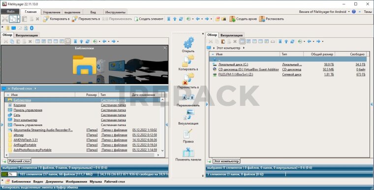 FileVoyager также поддерживает работу с внешними устройствами и сетевыми дисками, что делает её удобным инструментом для копирования и перемещения данных между различными источниками. Двухпанельный интерфейс позволяет выполнять операции с файлами быстрее и более эффективно, особенно при работе с большими объёмами данных.