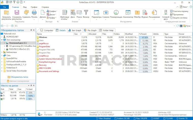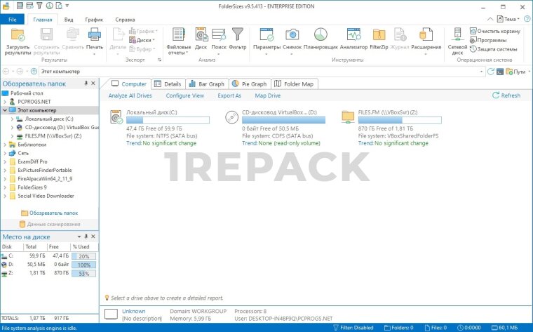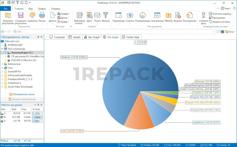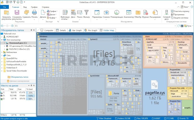 FolderSizes — это программное обеспечение для анализа и управления использованием дискового пространства на компьютерах. Программа позволяет пользователям детально изучать структуру папок и файлов, выявляя объекты, занимающие больше всего места. Интерфейс разработан с упором на удобство, обеспечивая интуитивно понятную навигацию и доступ к основным функциям без необходимости глубоких технических знаний.Основные функции FolderSizes включают сканирование жёстких дисков и других накопителей для определения размеров папок и файлов, а также предоставление визуальных отчётов о распределении пространства. Программа поддерживает различные методы визуализации, такие как деревья каталогов, круговые диаграммы и тепловые карты, что позволяет легко идентифицировать крупные файлы и ненужные данные. Кроме того, FolderSizes предлагает инструменты для фильтрации и сортировки результатов, упрощая поиск конкретных объектов.