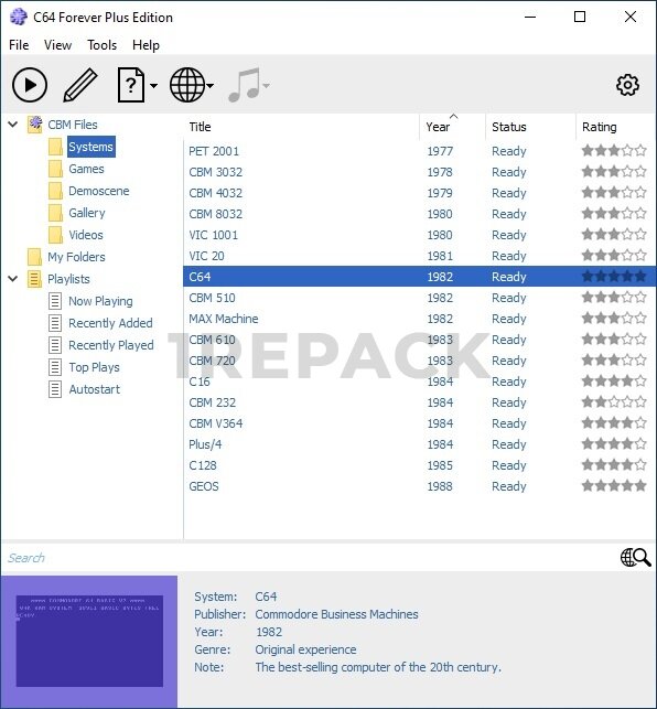 Cloanto C64 Forever Plus Edition — это эмулятор, который позволяет пользователям запускать игры и программы, разработанные для классического компьютера Commodore 64, на современных ПК. Программа создана для поклонников ретро-технологий, предлагая удобный способ погрузиться в атмосферу 1980-х годов с использованием старых приложений и игр. Она включает полный набор инструментов для эмуляции, включая поддержку оригинальных звуков, графики и интерфейсов C64.Основная функция C64 Forever Plus Edition — эмуляция платформы Commodore 64 с поддержкой запуска игр и программ прямо на компьютере. Программа предоставляет обширную библиотеку классических игр и программ, что позволяет пользователям быстро находить и запускать любимые ретро-забавы без необходимости ручной настройки. Все файлы и настройки оптимизированы для мгновенного использования.