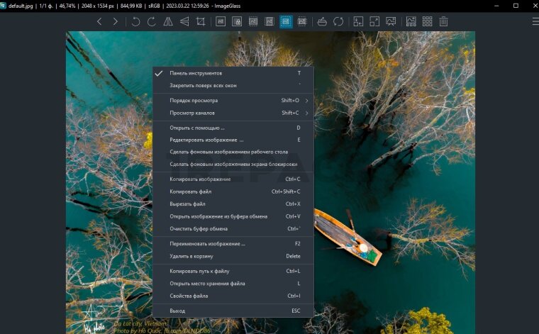 ImageGlass интегрируется с внешними графическими редакторами, такими как Photoshop или GIMP, что позволяет пользователям быстро открывать изображения для более сложного редактирования прямо из программы. Это особенно полезно для тех, кто часто работает с изображениями и нуждается в быстром доступе к мощным инструментам редактирования.