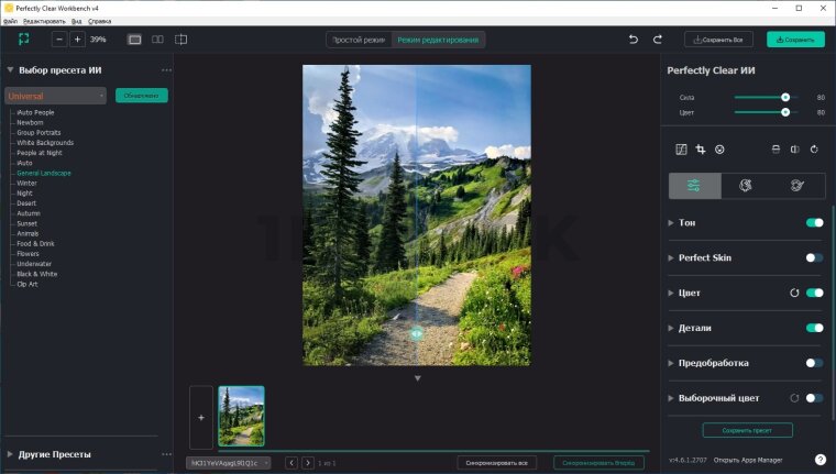 Perfectly Clear WorkBench — это программное обеспечение для автоматического улучшения фотографий, предназначенное как для профессионалов, так и для любителей. Эта программа использует запатентованные алгоритмы коррекции изображений, которые помогают добиться естественных и чётких результатов без лишних усилий. Инструмент подходит для обработки как отдельных фотографий, так и больших пакетов изображений.Основная функция Perfectly Clear WorkBench — улучшение фотографий с учётом ключевых параметров, таких как цвет, экспозиция, резкость и контраст. Программа позволяет исправить типичные недостатки изображений, такие как недостаточная резкость, слабая освещённость и неправильный баланс белого. Эти корректировки выполняются автоматически, но у пользователя остаётся возможность настроить параметры вручную для достижения более точных результатов.