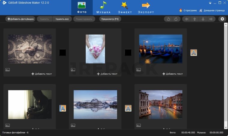 GiliSoft SlideShow Maker поддерживает добавление музыкального сопровождения к слайд-шоу, что позволяет пользователям улучшить атмосферу и сделать презентацию более эмоциональной. Можно выбирать аудиофайлы из личной коллекции или использовать предустановленные звуковые эффекты. Программа также позволяет синхронизировать музыку с переходами, что добавляет слайд-шоу профессиональный вид.