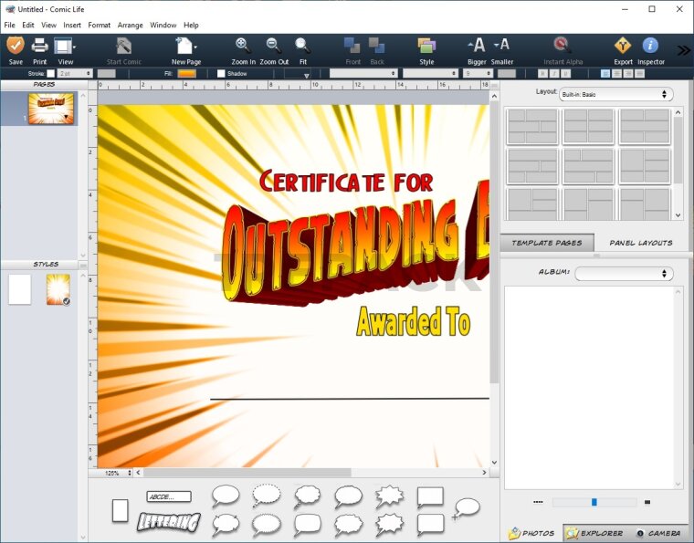 Comic Life — это интуитивно понятное программное обеспечение для создания комиксов, которое позволяет пользователям легко превращать фотографии, изображения и текст в профессионально оформленные комиксы, графические романы и иллюстрированные истории. Программа предназначена для художников, дизайнеров, учителей и всех, кто хочет создать увлекательные визуальные истории для развлечения, обучения или маркетинга. Comic Life сочетает в себе мощные инструменты для создания макетов с гибкими функциями редактирования текста и изображений, что позволяет пользователям создавать уникальные и креативные проекты.Программа предлагает множество предустановленных шаблонов и макетов для различных стилей комиксов, от классических полос до графических романов и современных веб-комиксов. Пользователи могут загружать свои изображения, фотографировать напрямую в программе или использовать встроенные фильтры для стилизации фотографий под рисунок, комикс или карикатуру. Comic Life поддерживает простое размещение текста, диалоговых облаков и заголовков, что делает процесс создания комиксов удобным и быстрым.