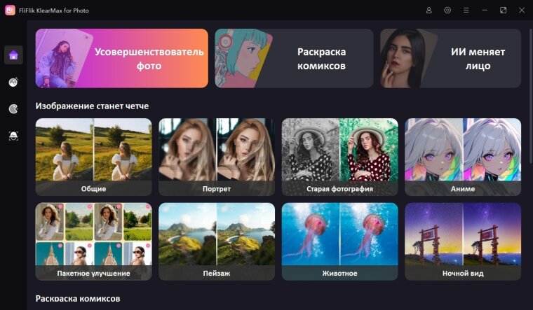 FliFlik KlearMax for Photo — приложение для компьютера, созданное для автоматической обработки и улучшения изображений с применением технологий искусственного интеллекта. Оно подходит для работы с фотографиями любого типа: от портретных снимков до пейзажей и сканов старых чёрно-белых изображений. Вся обработка выполняется в локальном режиме, без отправки данных в сеть.В программе предусмотрены отдельные режимы для различных задач. Для портретов можно выбрать мягкую ретушь, усиление чёткости или балансировку оттенков кожи. Пейзажные и ночные сцены обрабатываются с упором на удаление шума, повышение резкости и сохранение естественной цветопередачи. Аниме-изображения и манга получают отдельные настройки, с фокусом на прорисовку линий и улучшение контрастности.