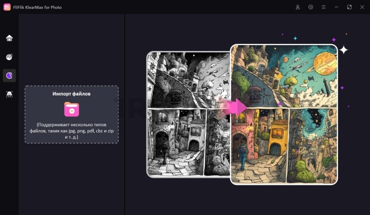 Среди дополнительных возможностей — перекраска чёрно-белых изображений в цвет, что особенно удобно при восстановлении старых семейных фото или сканов графических романов. Программа поддерживает популярные форматы изображений: JPG, PNG, BMP, WEBP, а также предоставляет инструменты для их быстрого преобразования и сохранения.