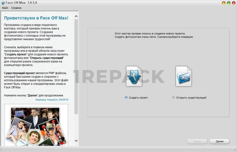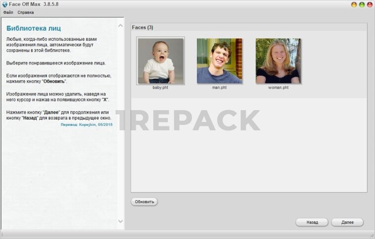 Face Off Max — это программа для замены лиц на фотографиях, предназначенная для пользователей Windows. Утилита предоставляет средства для вставки лица из одного снимка в другое изображение, сохраняя при этом пропорции, цветовой баланс и общее качество итогового коллажа. Программа подходит для создания фотоприколов, поздравительных открыток, коллажей, аватаров и других графических материалов, где требуется наложение лиц.Процесс редактирования происходит в пошаговом режиме. Пользователь загружает изображение-основу, после чего вставляет фотографию с лицом, которое нужно перенести. С помощью встроенных инструментов можно подогнать форму, положение и масштаб, чтобы результат выглядел максимально естественно. Настройка оттенков, яркости и прозрачности помогает добиться плавного перехода между слоями.