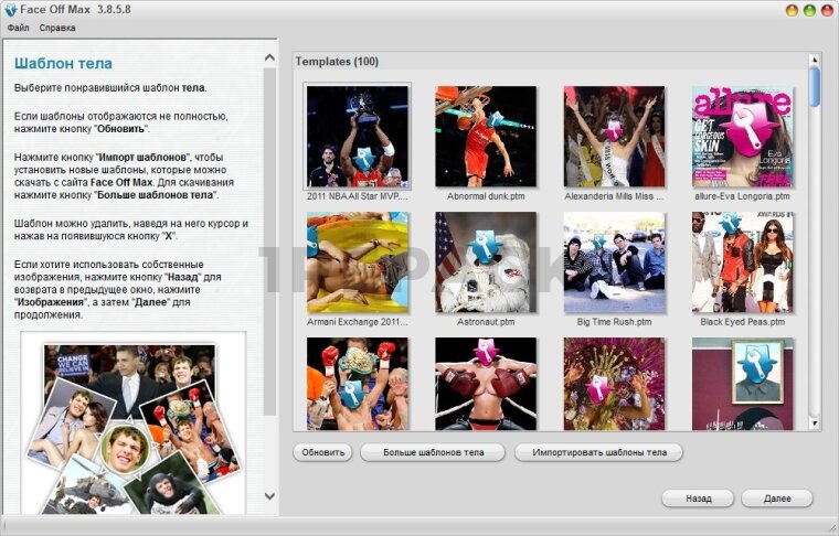 В программе предусмотрена библиотека готовых шаблонов, куда входят тела знаменитостей, костюмы, праздничные фоны и другие сцены. Это упрощает создание тематических работ, особенно если нужно подготовить шуточное фото за несколько минут. Также можно использовать собственные изображения, что расширяет возможности работы с материалами.