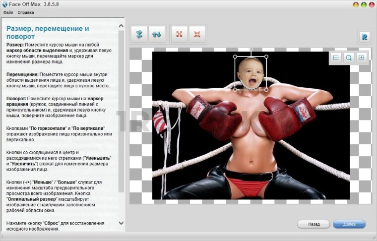 - Настройка размеров, угла наклона и прозрачности вставленного лица