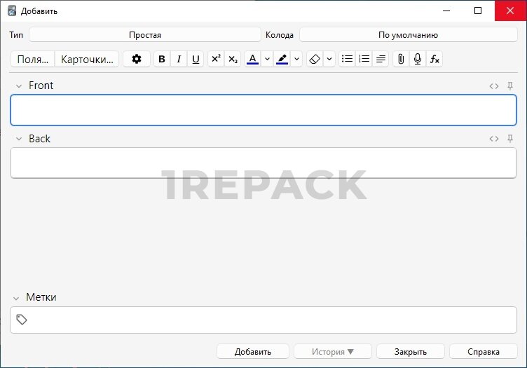 - Создание карточек с текстом, изображениями, звуками и видео;