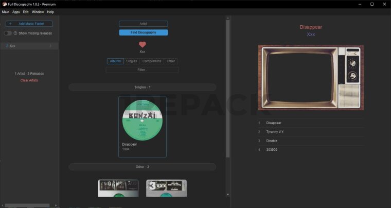 Full Discography — это программа для Windows, предназначенная для меломанов, желающих систематизировать и изучить полные дискографии любимых исполнителей. Приложение предоставляет доступ ко всем альбомам, синглам и другим релизам артистов, а также уведомляет о новых выпусках.С помощью Full Discography можно быстро находить и прослушивать все композиции выбранного исполнителя. Программа позволяет отслеживать недостающие релизы в вашей музыкальной коллекции и получать уведомления о новых альбомах и синглах.