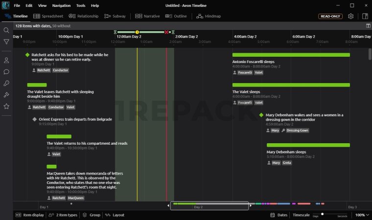 Aeon Timeline — это программа, созданная для построения сложных временных структур с возможностью глубокой детализации и управления связями между событиями. Она позволяет пользователю организовывать данные по времени, выстраивать причинно-следственные цепочки и отслеживать, как одно изменение влияет на остальные элементы проекта.Каждое событие можно оформить с точностью до дня, часа или даже минуты, привязать его к участникам, локациям, артефактам или другим пользовательским сущностям. Объекты объединяются в категории, получают описания, цветовые метки и дополнительные свойства. Всё это помогает создать полную и наглядную картину происходящего в любой точке временной шкалы.