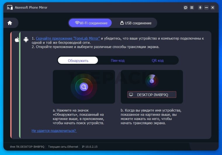 Aiseesoft Phone Mirror поддерживает подключение как по Wi-Fi, так и через USB, что позволяет выбрать наиболее удобный вариант в зависимости от ситуации. Для пользователей, которым требуется стабильное соединение для демонстраций или игр, подключение через USB обеспечивает минимальную задержку и высокую чёткость отображения.