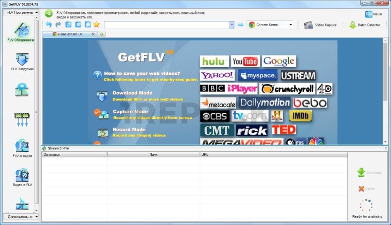 - Встроенный плеер для воспроизведения FLV-видео прямо в программе