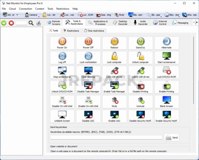 Программа поддерживает функцию удалённого управления компьютерами, что позволяет администраторам не только наблюдать за действиями, но и вмешиваться при необходимости. Например, можно заблокировать доступ к определённым приложениям или сайтам, запускать команды или даже полностью выключить или перезагрузить удалённые машины. Это делает Net Monitor for Employees Professional полезным инструментом для IT-администраторов и менеджеров, которые должны поддерживать дисциплину и соблюдение правил безопасности.