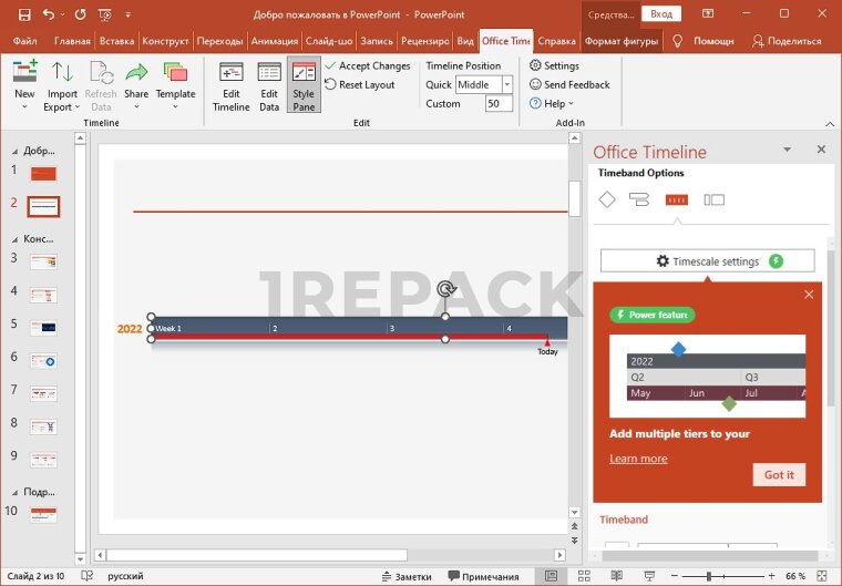 Office Timeline Plus / Pro — это инструмент для создания временных диаграмм и графиков прямо в Microsoft PowerPoint. Программа помогает пользователям быстро и легко строить профессионально выглядящие временные шкалы, упрощая процесс создания презентаций и отчетов для проектов и планирования.Office Timeline позволяет создавать наглядные диаграммы, такие как временные шкалы, диаграммы Ганта и календари, которые могут быть полезны в управлении проектами, маркетинговых стратегиях и других задачах, требующих четкого представления временных данных. Благодаря интеграции с PowerPoint пользователи могут добавлять свои диаграммы непосредственно в слайды, делая их часть презентации.