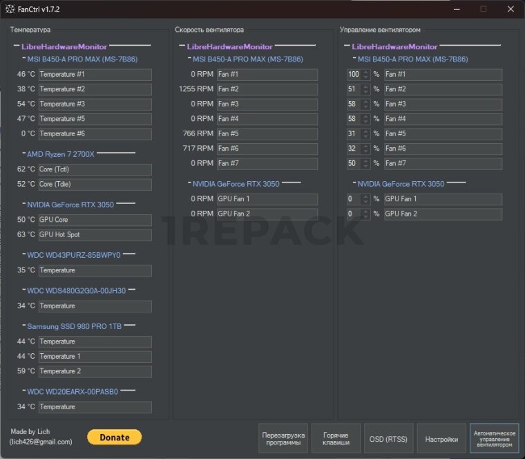 FanCtrl — это программное обеспечение, позволяющее пользователям управлять скоростью вентиляторов в компьютере, обеспечивая оптимальное охлаждение и снижая уровень шума системы. Программа предоставляет гибкий контроль над всеми вентиляторами, включая системные и процессорные, а также позволяет устанавливать пользовательские кривые скорости в зависимости от температуры различных компонентов, таких как CPU и GPU.С помощью FanCtrl можно настроить автоматическое регулирование скорости вентилятора в зависимости от температурных показателей. Программа позволяет задать индивидуальные профили для разных сценариев использования, будь то игра, работа с ресурсоёмкими программами или обычное использование. Это помогает поддерживать оптимальный баланс между охлаждением и шумом, соответствующий конкретной задаче.