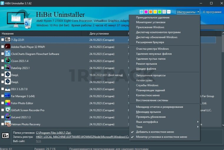 - Полное удаление программ с удалением остатков файлов и реестра