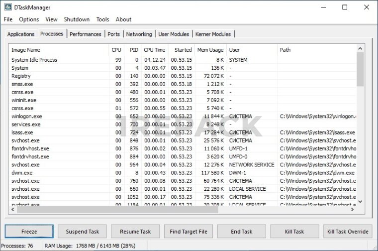 DTaskManager представляет собой расширенное программное обеспечение для управления задачами и процессами на компьютерах под управлением Windows. Программа предоставляет пользователям детальный контроль над запущенными приложениями, системными процессами и ресурсами, обеспечивая эффективное управление производительностью системы.Интерфейс DTaskManager организован интуитивно понятным образом, позволяя легко отслеживать активные процессы, использование оперативной памяти, загрузку процессора и другие ключевые показатели производительности. Пользователи могут быстро идентифицировать ресурсоемкие приложения и принимать решения для оптимизации работы системы.