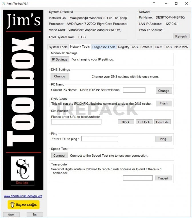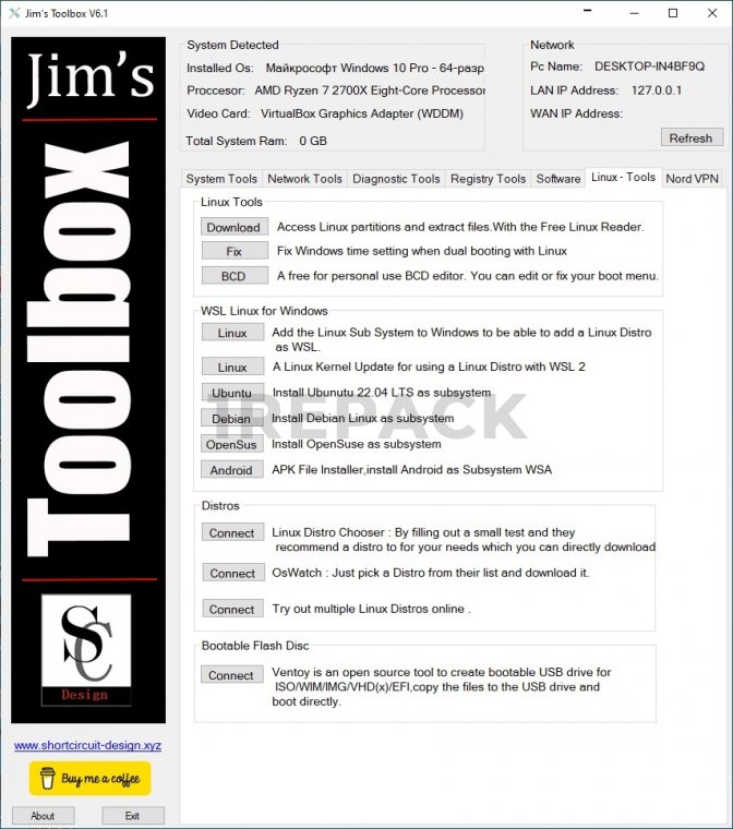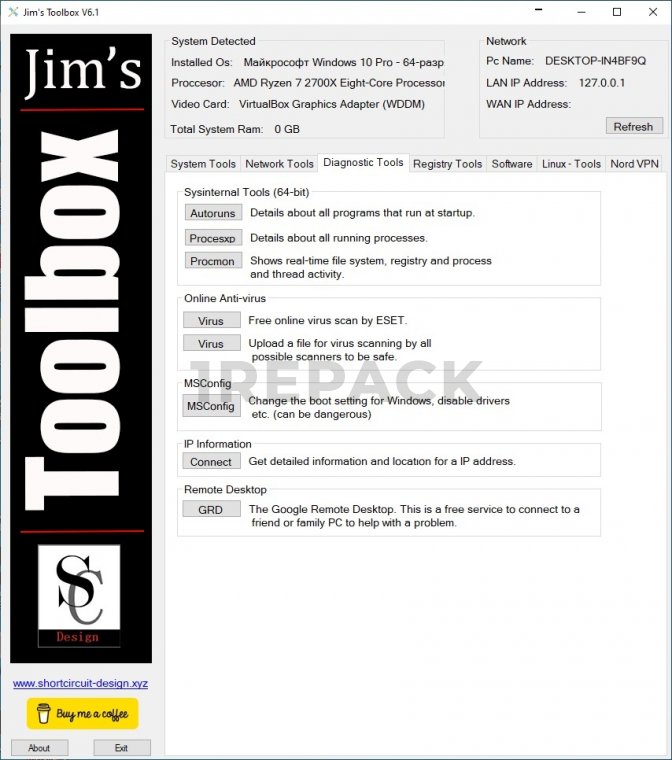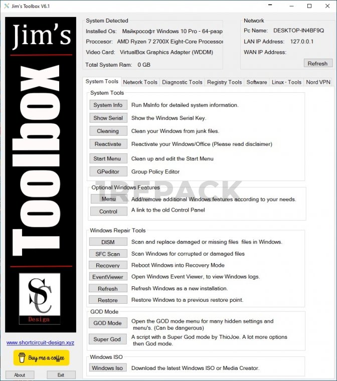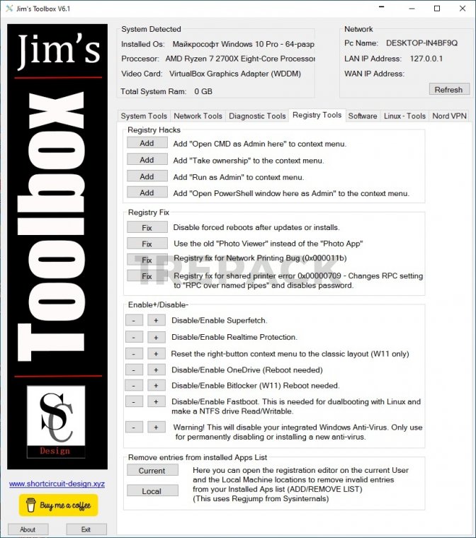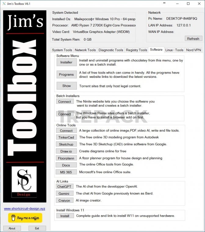 Jim’s Toolbox — портативный набор вспомогательных утилит, который объединяет в одном интерфейсе десятки системных функций, обычно разбросанных по панели управления, меню «Пуск» и командной строке. Программа предназначена для быстрой настройки, диагностики и обслуживания компьютера, упрощая доступ к нужным инструментам без необходимости вручную искать их в глубинах системы.Каждая функция вынесена в виде отдельной кнопки или команды, что позволяет запускать нужные действия напрямую. Здесь собраны инструменты для работы с сетью, управления службами, очистки временных данных, запуска встроенных мастеров Windows и работы с системными параметрами. Всё распределено по логическим категориям — например, "Сеть", "Очистка", "Обновления", "Обслуживание", — чтобы пользователь не тратил время на лишние переходы.