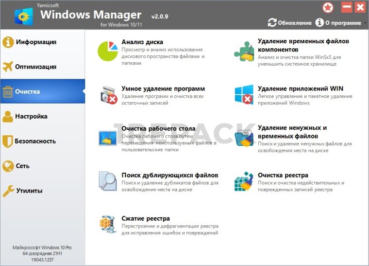 - Очистка системы от ненужных файлов и реестра;