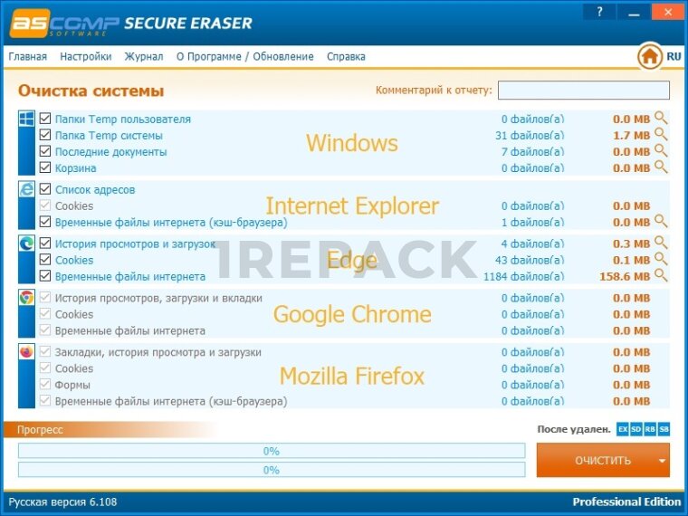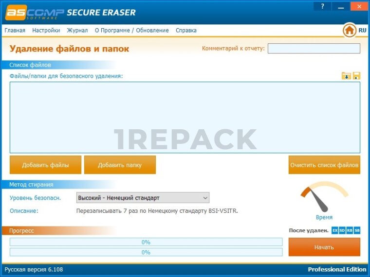 ASCOMP Secure Eraser Professional — это программа для безопасного удаления данных с компьютера, которая предоставляет расширенные методы очистки файлов, чтобы исключить возможность их восстановления. Она поддерживает различные алгоритмы перезаписи данных, что гарантирует удаление информации на уровне безопасности, соответствующем международным стандартам.Secure Eraser позволяет стирать файлы, папки, системные журналы и даже весь жёсткий диск, полностью удаляя личные и конфиденциальные данные. Это особенно полезно при подготовке устройства к продаже или передаче другому пользователю, чтобы защитить информацию от восстановления.